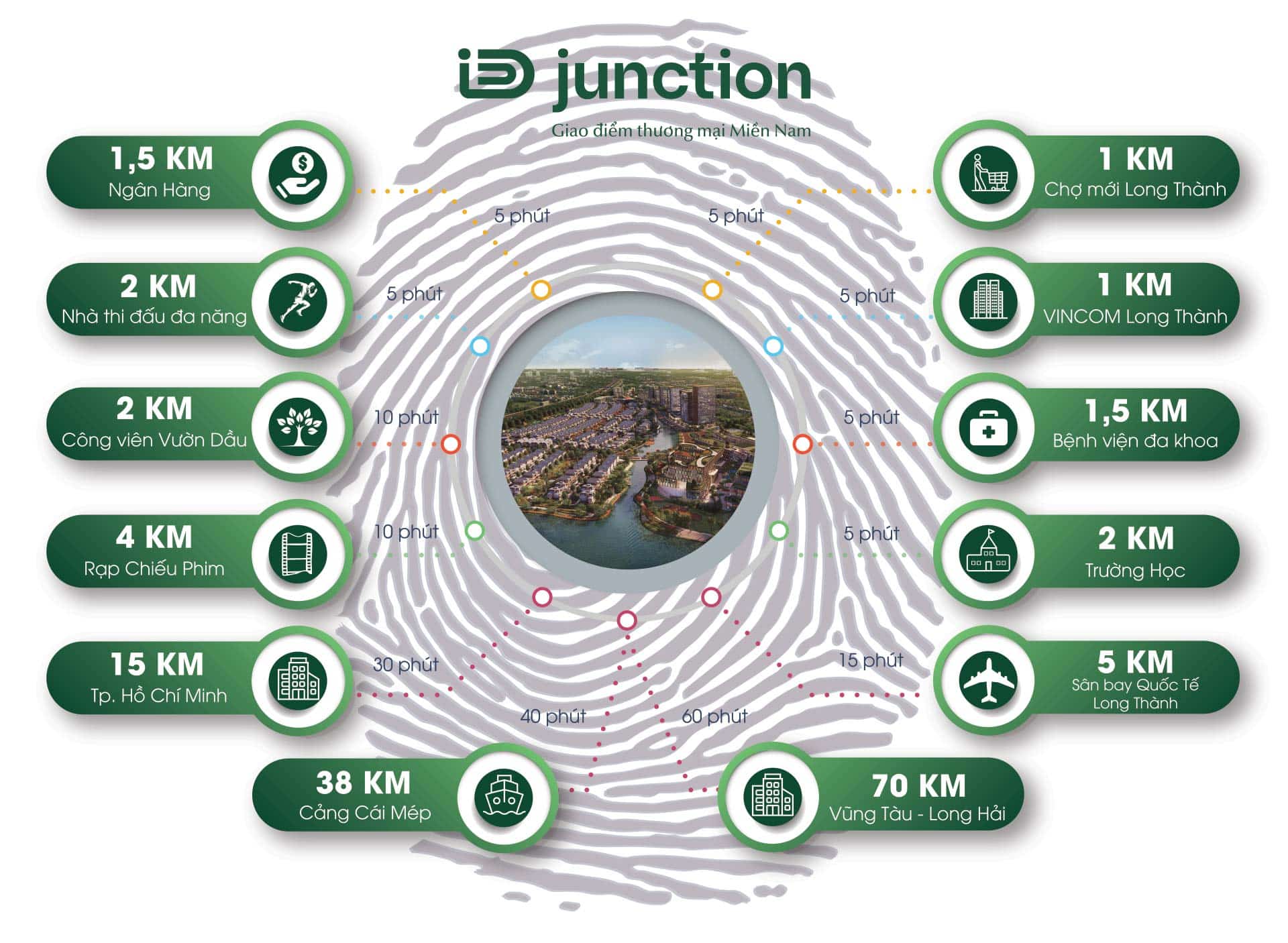 Nằm ngay khu dân cư hiện hữu, iD Junction kết nối với các tiện ích ngoại khu: Chợ mới Long Thành: 1km; TTTM Vincom: 1,5km; Trường cấp 1,2,3: 2km; Trung tâm hành chính Long Thành: 2km; Nhà văn hóa: 3km; TT thể dục thể thao Long Thành: 2km; Ngân hàng: 1,5km; Công viên Vườn Dầu: 2km