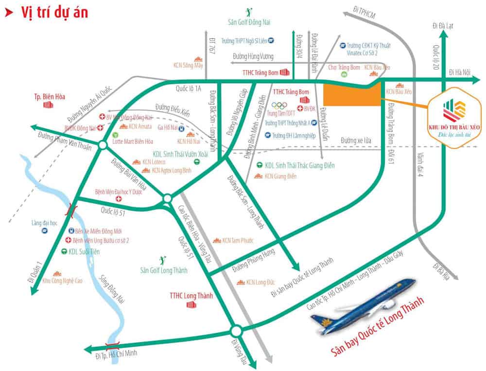 Đặc biệt khu đô thị Bàu Xéo trên trục đường kết nối huyện Trảng Bom – sân bay quốc tế Long Thành và được bao quanh nhiều tuyến giao thông huyết mạch như Quốc lộ 51, Võ Nguyên Giáp, Vành đai 4, cao tốc Long Thành – Dầu Giây, Cao tốc Biên Hòa- Vũng Tàu. Với lợi thế này, dự án đất nền khu đô thị Bàu Xéo có tiềm năng trở thành một trung tâm kinh doanh sầm uất bậc nhất tại đồng nai ngay gần cửa ngõ sân bay quốc tế Long Thành – Đồng Nai