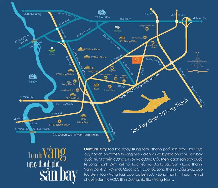 - Nằm ngay lõi trung tâm “thành phố sân bay” và là trung tâm giáo dục, đào tạo nguồn nhân lực và phát triển kỹ thuật cao của Đồng Nai.