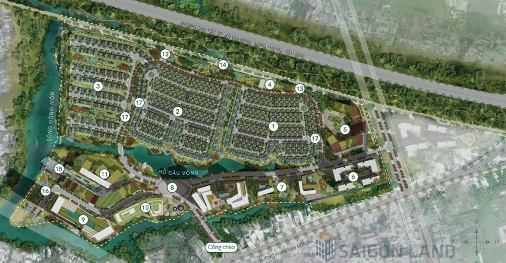 - Điểm nổi bật: mảng xanh nhiều với các công viên trải dài theo các tuyến đường tản bộ, địa hình cao thấp độc đáo, lối đi riêng cho từng khu nhà và các nhiều tiện ích công cộng.
