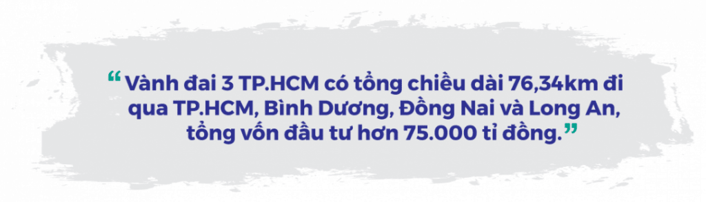 Cụ thể, Vành đai 3 TP.HCM có tổng chiều dài 76,34km đi qua TP.HCM, Bình Dương, Đồng Nai và Long An, tổng vốn đầu tư hơn 75.000 tỉ đồng.